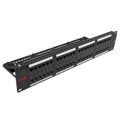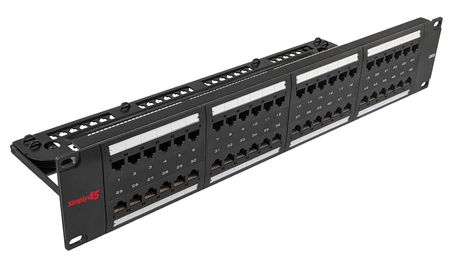 Simply45 patchpanel til rackmontering med 48 porte, CAT6 UTP. Nem montering på standard 19” rack. IDC kompatibel med 110 og Krone værktøjer.