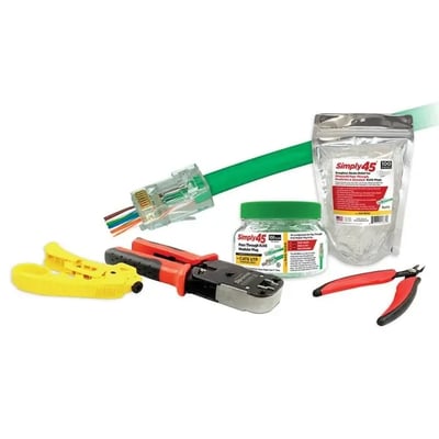 Crimpværktøjet i sættet er optimeret til at give et ensartet tryk på stikket under crimpning, hvilket resulterer i en bedre terminering. Dette reducerer den nødvendige kraft og gør det muligt at lave flere stik, før træthed i hånden opstår. For de bedste resultater anbefales det at bruge Simply45 crimpværktøj S45-C101 i kombination med bidetang S45-801 og afisoleringsværktøj S45-S01BL (blå) eller S45-S01YL (gul).