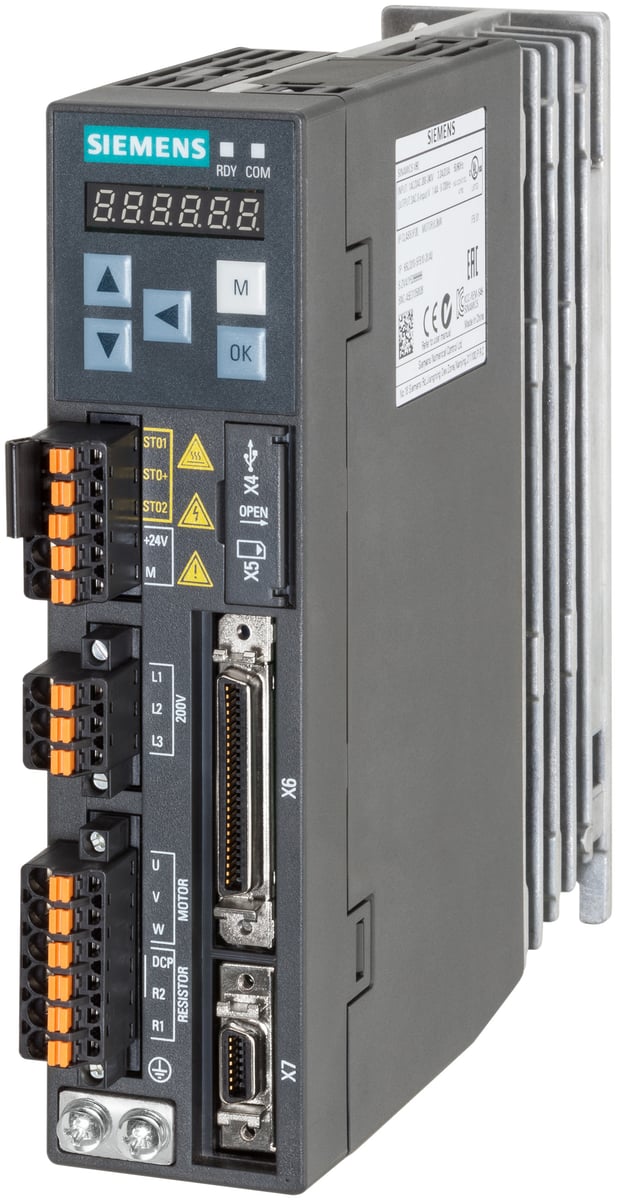 SINAMICS V90 med input: 1/3 AC 200-240V, 5,0A/3,0A, output: 0-input V, 2,6A, 0-330HZ, IP20, 0,4KW og ramme størrelse B.