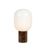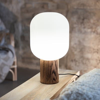 Skene bordlampe med plads til én lyskilde. Lampen er udført i hvid og brændt træ, og har en klar ledning med afbryder.