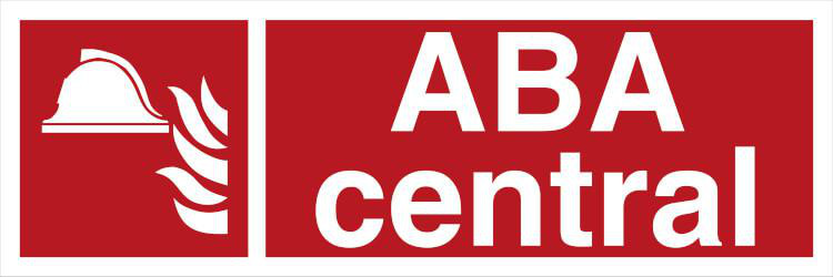 Brandskilt med dansk tekst ABA-central, produceret på selvklæbende refleksvinyl, (1/2 A3) 140 x 420 mm. Tekst og symbol følger DS/EN ISO 7010:2011.