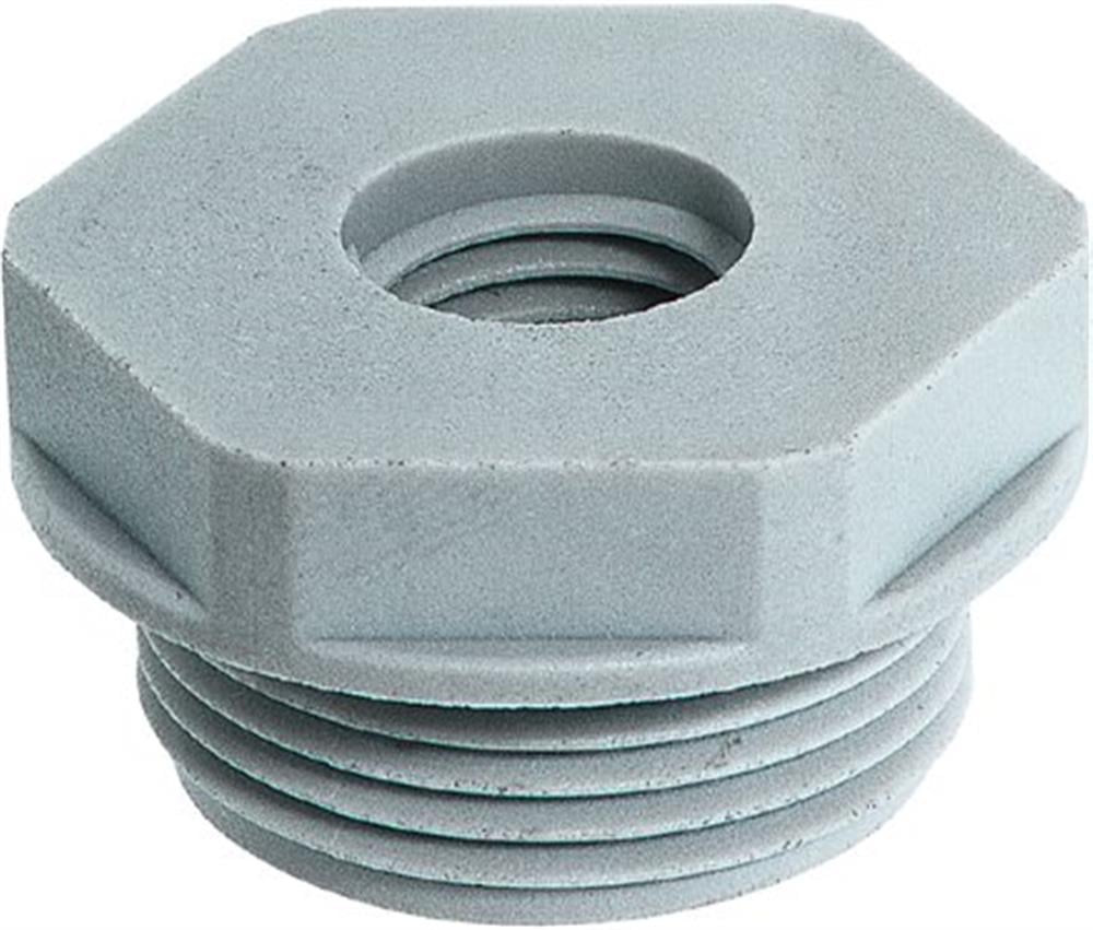 Reduktion i lysegrå glasfiberforstærket polyamid (PA6). Temperaturområde: -40°C til +100°C. Gevind: M32 - M16.
