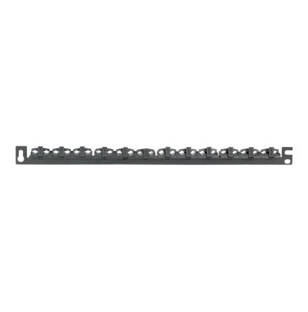 Skinne til trækaflastning med integrerede justerbare clips. Understøtter op til 24 kabler. Farve: Sort.