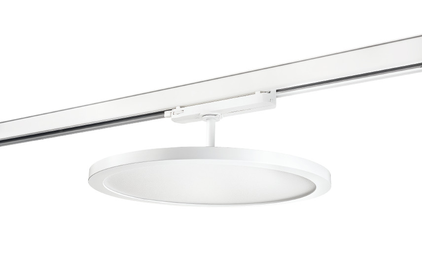 Med sit stilfulde og tynde design har armaturet en opal prismatisk front, der effektivt retningsbestemmer lyset og minimerer blænding. Driveren er integreret i skinneadapteren for en strømlinet installation.