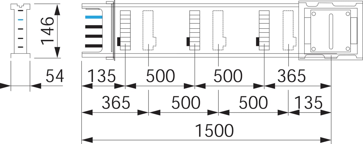 - Længde af kanalskinnernes komponenter: 3 m og 5 m