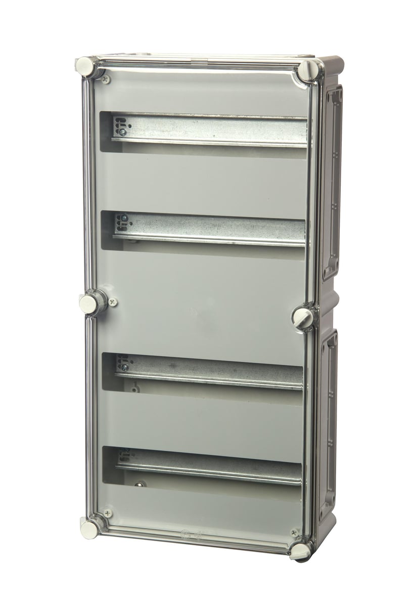 Robust DIN-skinnekasse THTD-4 med plads til 4 x 14 moduler. Måler 560x280x130 mm og har en IP65-klassificering.