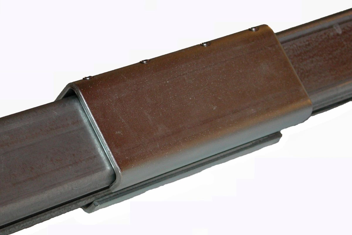 Samlemuffe til portskinne med 4 stk. 6 mm pinolskruer. L: 130 mm, B: 51 mm. Fremstillet i stål med dracomet-behandling.