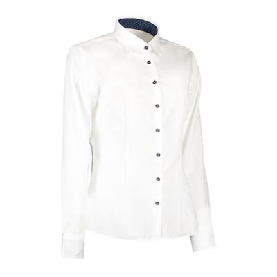 Denne moderne business-skjorte til damer er fremstillet i Fine Twill-kvalitet med en Non Iron-finish, der sikrer et strygefrit look. Skjorten har en klassisk model med en behagelig pasform og stilfulde kontrastdetaljer indvendigt i flip og manchet.
