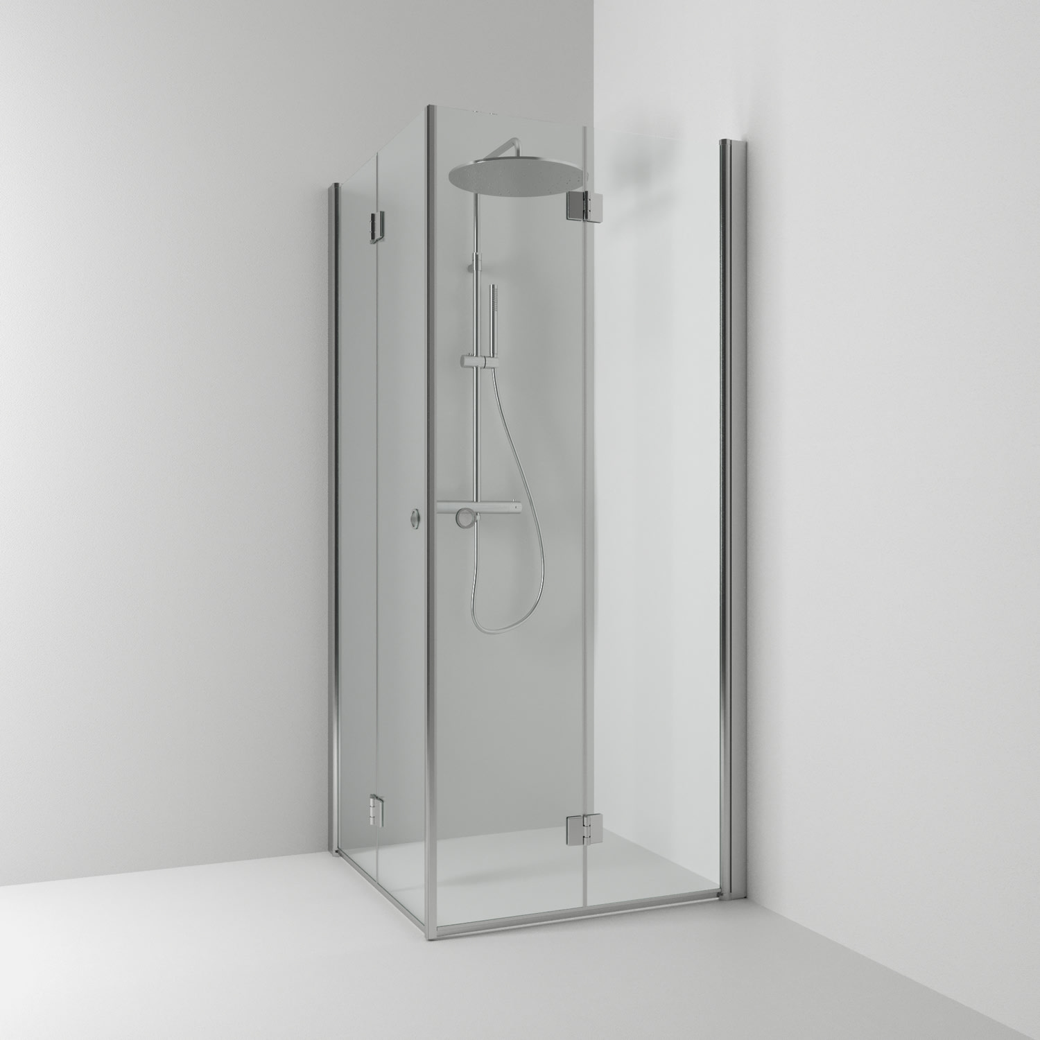 Produktet er fremstillet i hærdet sikkerhedsglas og har en vægprofil, der giver mulighed for rørgennemføring 30 mm fra væg. Fleksibel montering med vendbare hængsler.