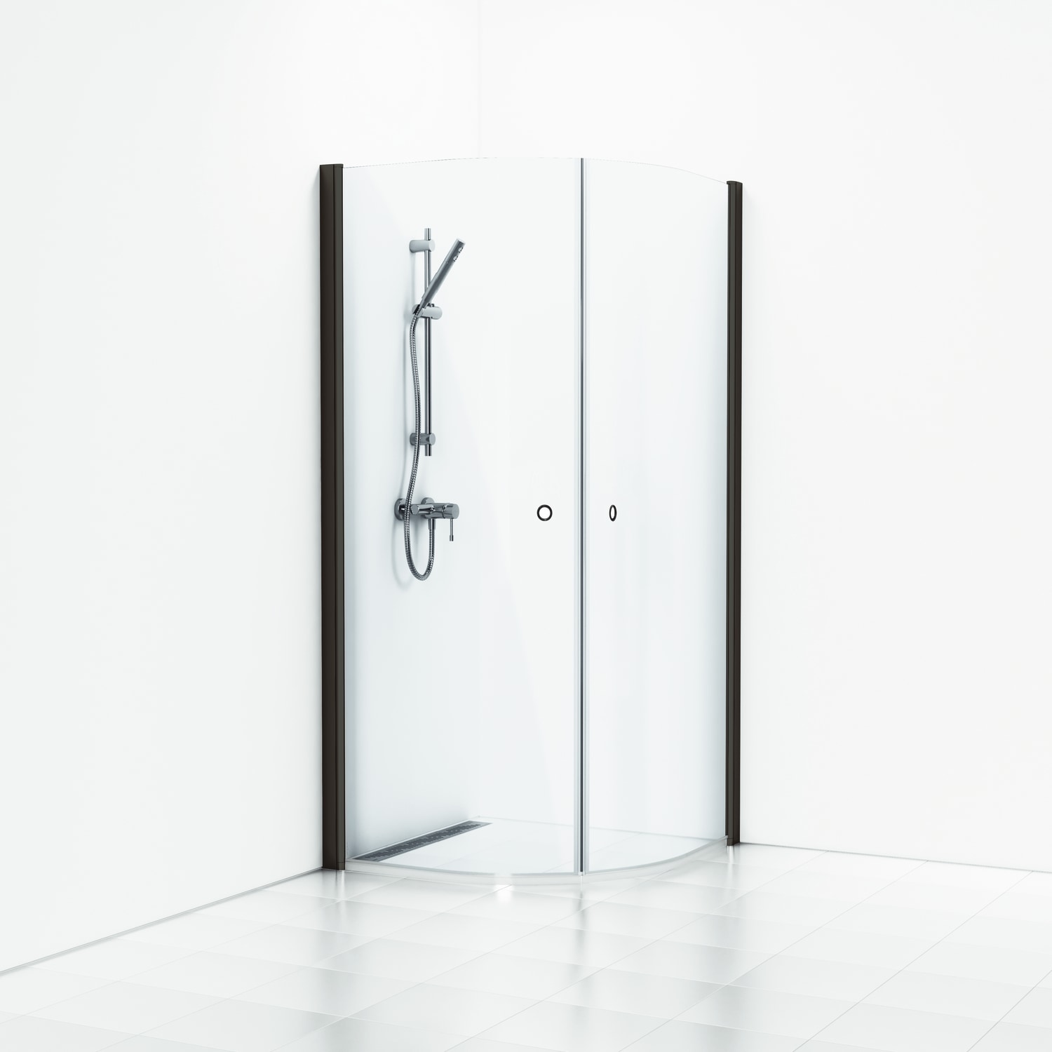 Stilrent, halvrundt brusehjørne fra Skoga med sort mat profil og klart glas. Mål: 80x80x198 cm. Integreret greb og justerbar profil.