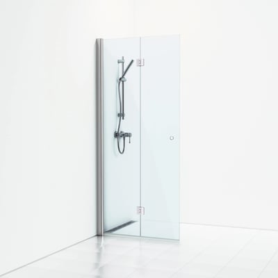Skoga skærmvæg med moderne design giver et stilrent badeværelse. Foldedør med klart glas, aluminiumsprofil og integreret greb. Mål: 76 x 198 cm.