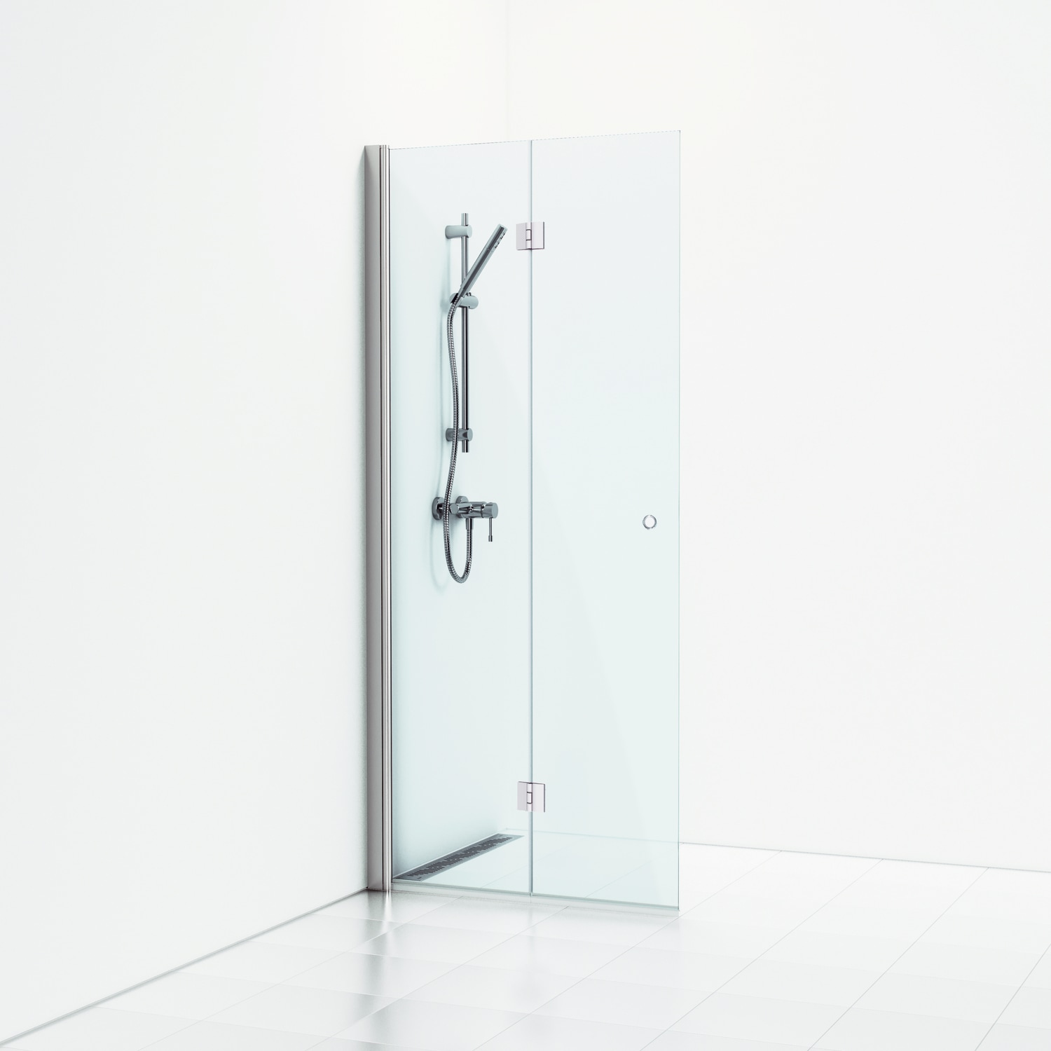 Skoga skærmvæg med moderne design giver et stilrent udtryk til badeværelset. Foldedør med klart glas, alu blank profil og integreret greb.