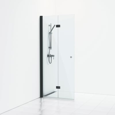 Skoga skærmvæg med moderne design giver et stilrent badeværelse. Foldedøren er med sort mat profil, klart glas og integreret greb.