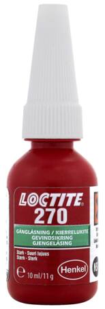 LOCTITE® 270 er en højstyrke gevindsikring med maksimal effektiv sikring af bolte, møtrikker og stag imod løsning ved vibrationer. Produktet sikrer permanent låsning af samlinger, der ikke må løsnes. Det fungerer på alle metaller, inklusive rustfrit stål, aluminium og platerede overflader. Produktet er tolerant overfor mindre forurening fra industrielle olier, f.eks. motorolie, korrosionbeskyttende olier og skærevæsker.