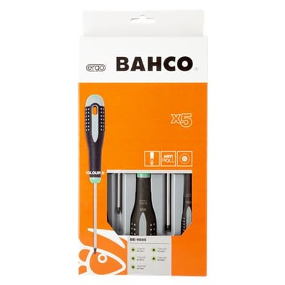 Bahco skruetrækkersæt med 5 dele. Ergonomisk 3-komponent skaft sikrer komfortabelt greb. Klinge af VANADIUM EKSTRA stål med forkromet, højglanspoleret finish og sortoxyderet "Pro-Point" spids.