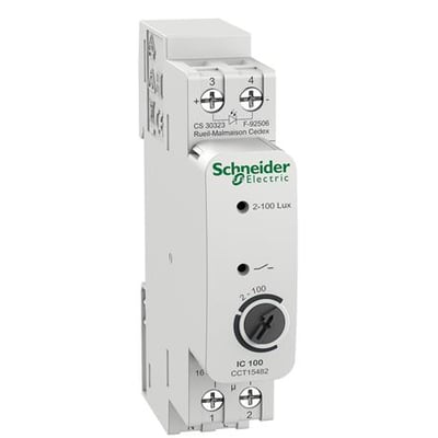 Denne skumringstimer IC 100 fra Schneider Electric er designet til effektiv styring af belysningssystemer. Den har en justerbar tærskelværdi fra 2 til 100 lux, hvilket giver mulighed for præcis tilpasning til de specifikke lysforhold.