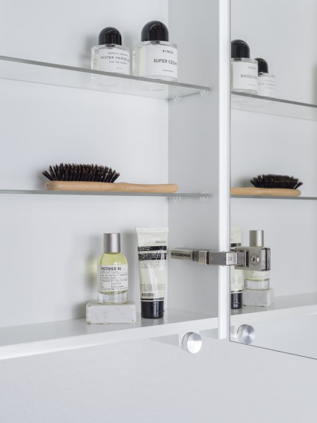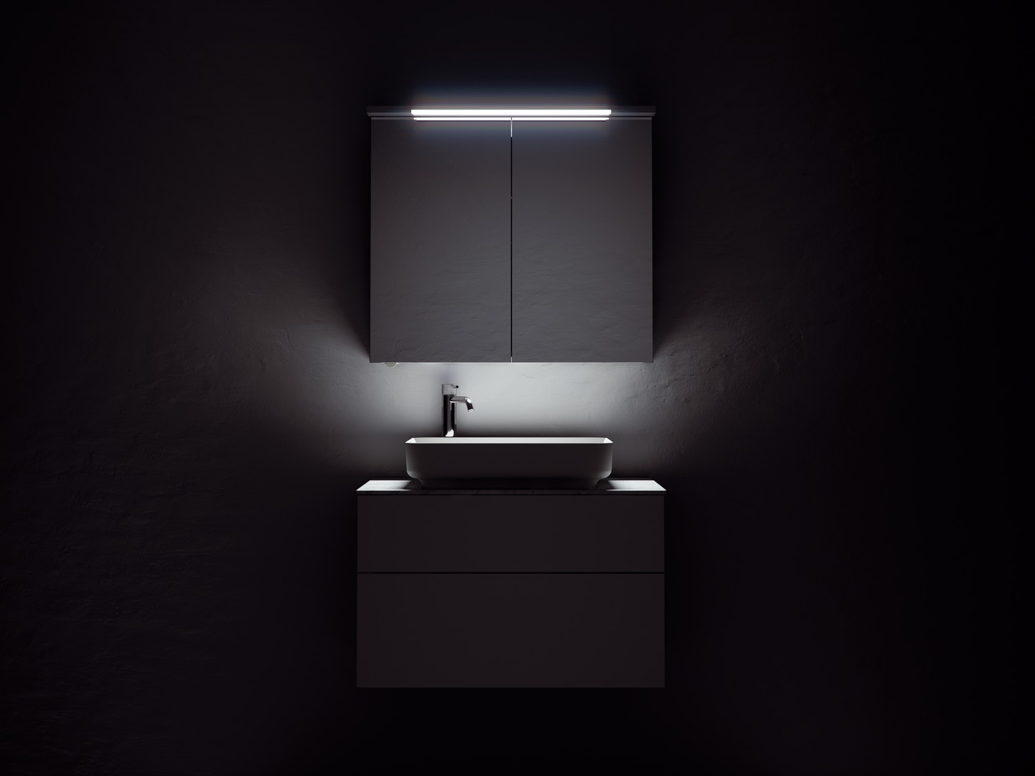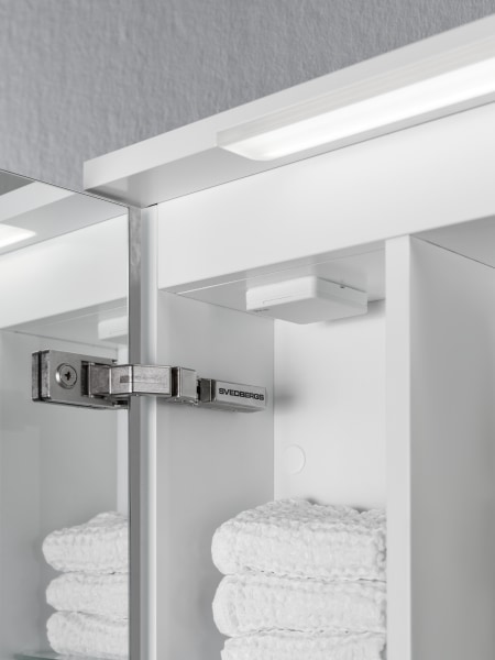 Skuru spejlskabet kombinerer skandinavisk design med avanceret, justerbar belysning. Både lysstyrke og lystemperatur kan nemt justeres via en regulator på spejlskabet.