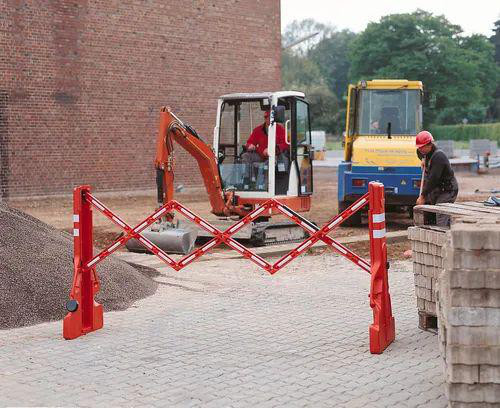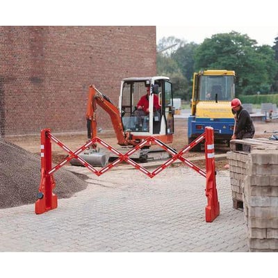 Denne trinløse, udtrækkelige skydeafspærring er designet til hurtigt at sikre potentielle fareområder. Transporthuset fungerer samtidig som fødder, hvilket gør den let at håndtere og placere.