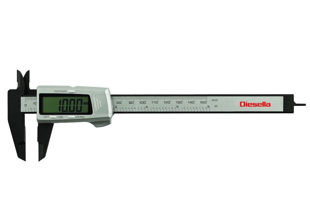 Digital skydelære fra Diesella i carbon fiber. Måler fra 0-150 mm med 0,01 mm aflæsning og 40 mm kæbelængde. Med automatisk tænd/sluk funktion og fladt dybdemål.