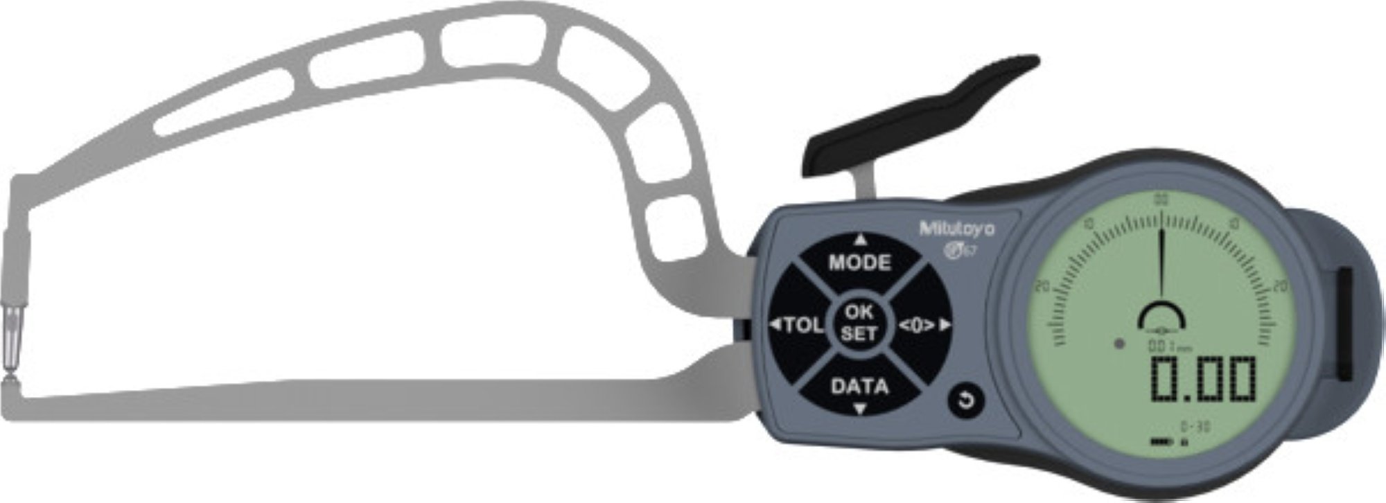 Digital skydelære til udvendige målinger. Måler fra 0-30mm med en opløsning på 0,01mm. Med hårdmetal kugle D=3mm og IP67 klassificering.