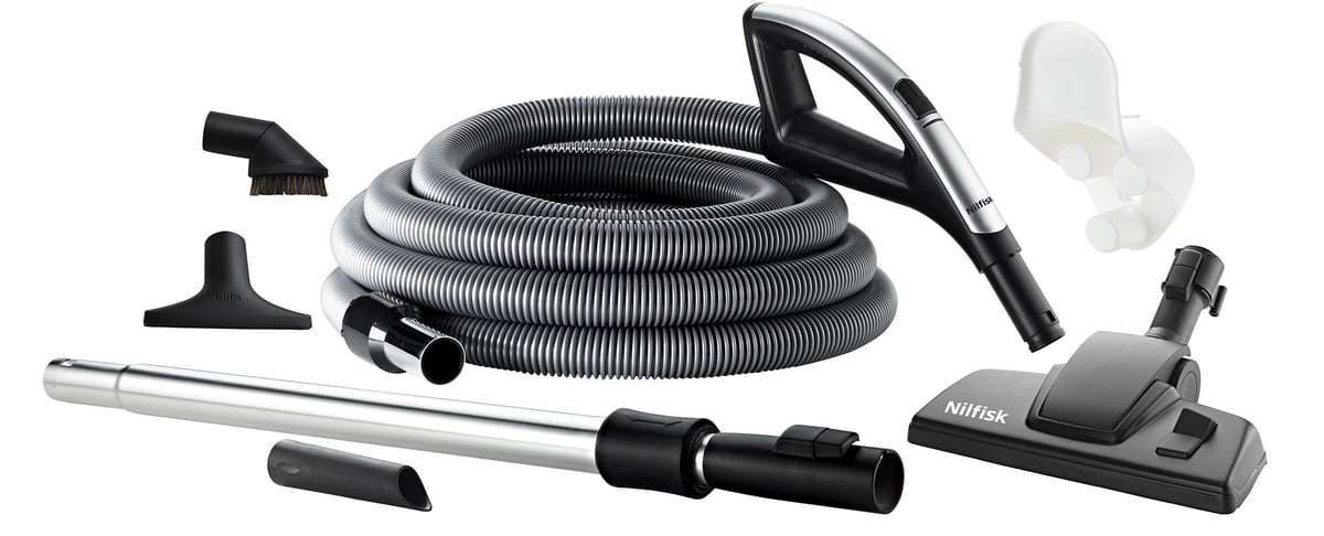 Nilfisk Wireless+ slangesæt med 3-trins sugestyrkeregulering. Indeholder teleskoprør, mundstykke til gulv, 3 små mundstykker, slangeholder og trådløs modtagerboks.