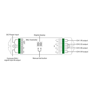 Denne 4-kanals 12-36VDC DALI controller er designet til alsidig lysstyring. Den kan konfigureres med 1, 2, 3 eller 4 adresser, hvilket giver fleksibilitet i installationen.