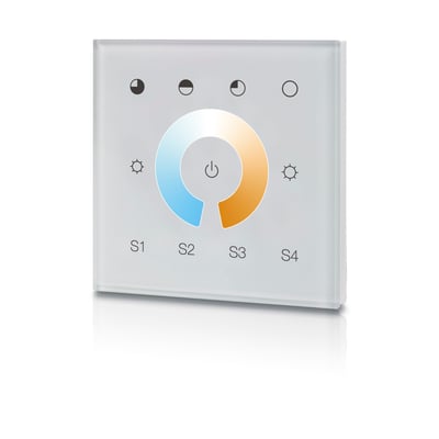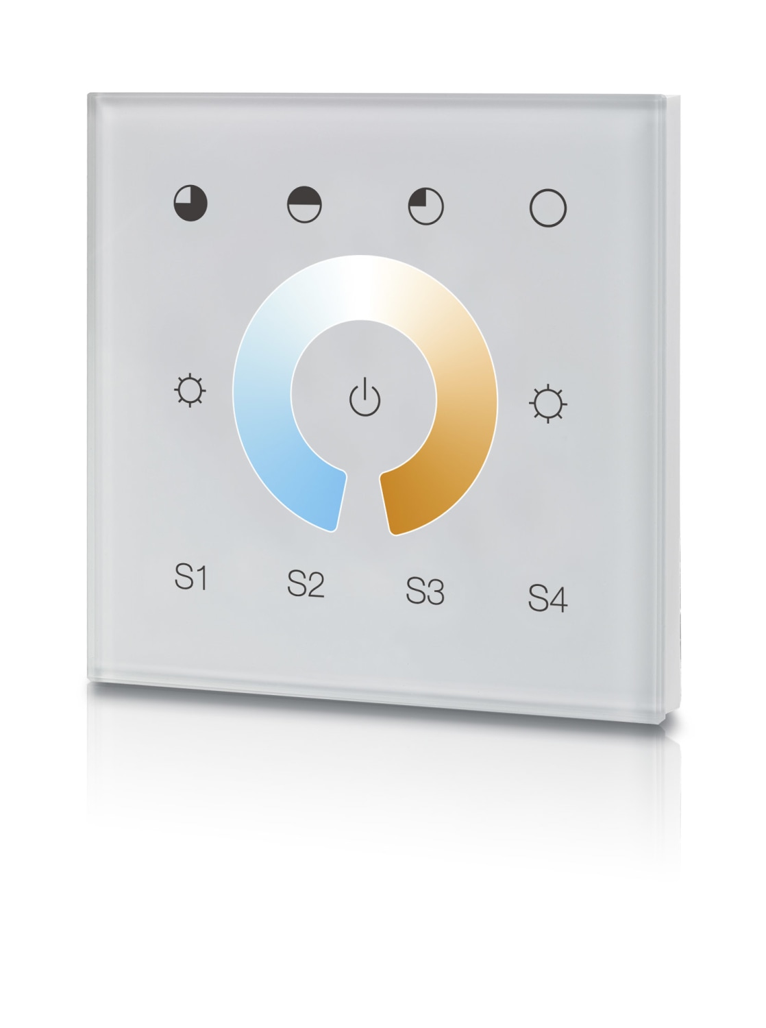 Dette touch panel giver dig mulighed for at justere farvetemperatur og lysstyrke på en enkelt kanal eller via broadcast. Panelet fungerer som en DALI master, hvilket betyder, at det kan bruges uden en central DALI bus. Det kan også opsættes som slave.