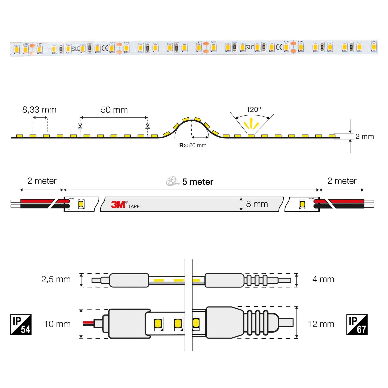 Projekt-strip med godt lysudbytte og lav effekt. Velegnet til direkte, design- og baggrundsbelysning. 120 LED-dioder pr. meter sikrer en jævn lyslinje. Skal monteres i profil for køling.