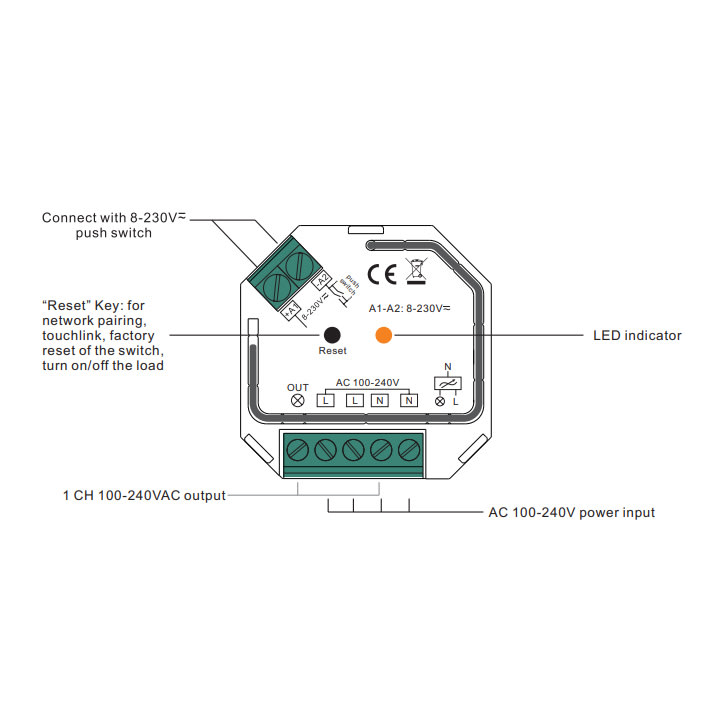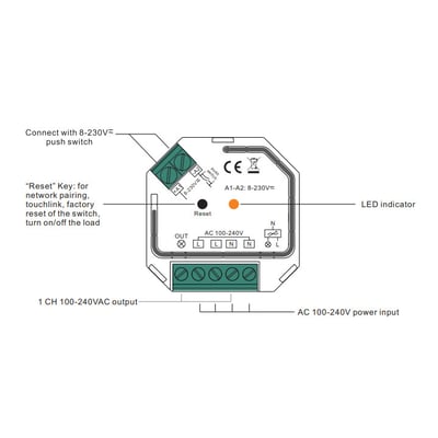 Zigbee 3.0-baseret on/off-bryder med 100-240V AC indgangs- og udgangsspænding. Push-indgang og kompatibel med de fleste smarthussystemer. Understøtter TouchLink-kommunikation.