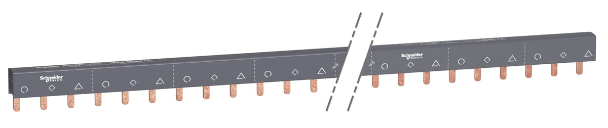 Denne 3-polede sløjfeskinne fra Schneider Electric forenkler installationen af Acti 9-produkter. Med 100A mærkestrøm og 57 moduler er den nem at afkorte og sikrer en overskuelig tavleopbygning.