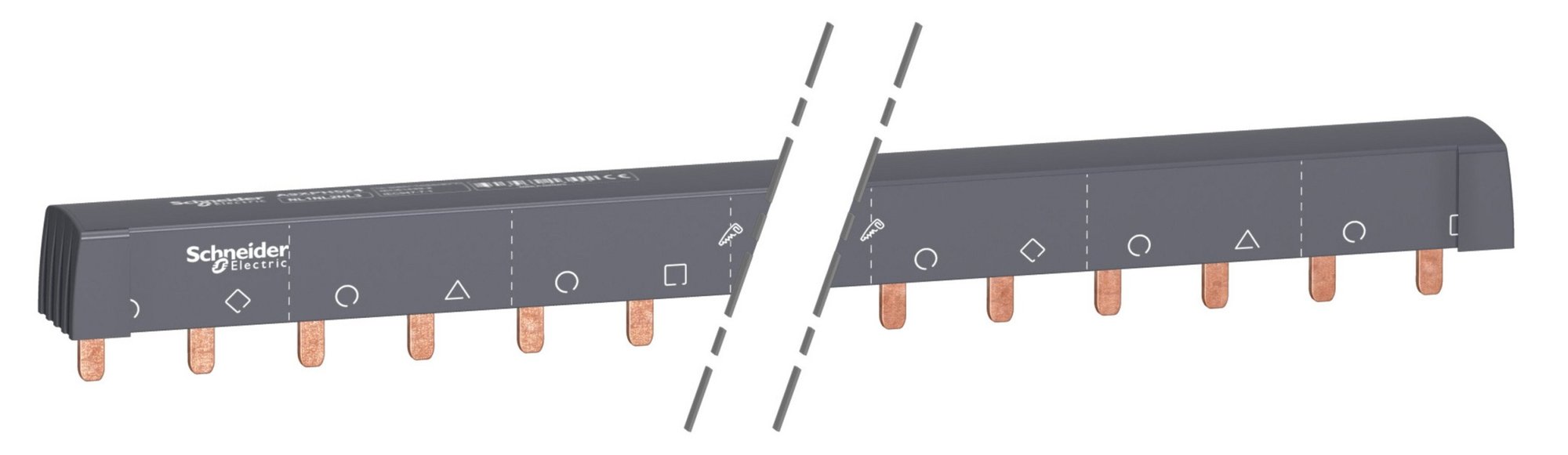 Sløjfeskinne fra Acti9 serien, der forenkler installationen af Schneider Electric-produkter. Kan tilskæres og har tydelige fasemarkeringer.