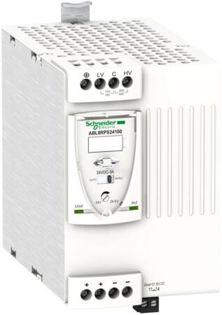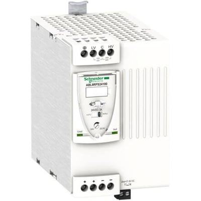 Schneider Electric ABL8RPS24100 reguleret switch-mode strømforsyning (SMPS) leverer jævnspænding. Forsynes med 100 til 500Vac og har en nominel udgangsstrøm på 10A.
