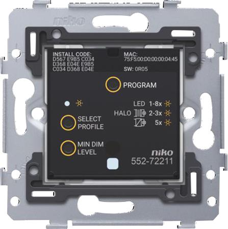 Smart lysdæmper med Zigbee® til betjening af belysningen. Kommunikerer trådløst med smart-hub (552-00001) til Niko Home Control. Kræver tangent (xxx-31002) og ramme (xxx-76100).