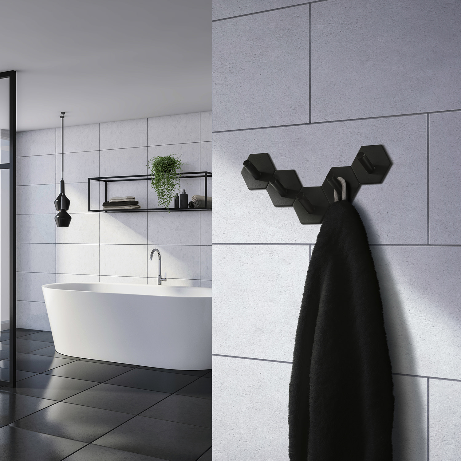Selvklæbende enkeltkrog i hexagon-design fra Smedbo Beslagsboden. Perfekt til håndklæder, med en mat sort overflade og nem montering uden boring.