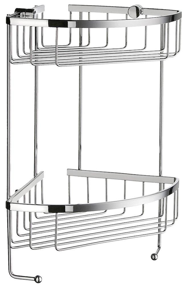 Smedbo dobbelt hjørnebrusekurv i poleret krom, fremstillet af massiv messing, der sikrer rustfri holdbarhed. Inkluderer to kroge til ophæng og har skjult montage. Måler 195 x 195 mm.