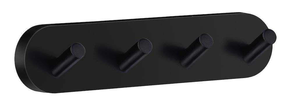 Stilfuld knagerække med fire kroge i matsort messing. Perfekt til badeværelse, entré eller soveværelse med sit enkle design og skjulte montering.