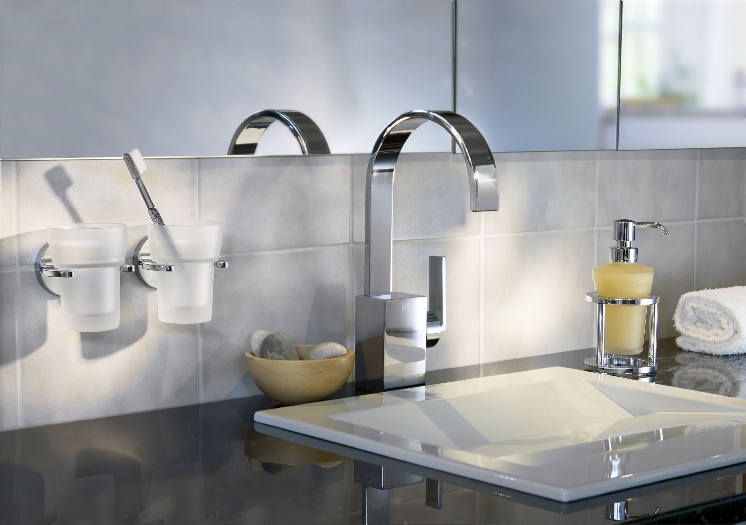 Stilfuldt og funktionelt Smedbo house vægmonteret tandglas i krom med materet glas.