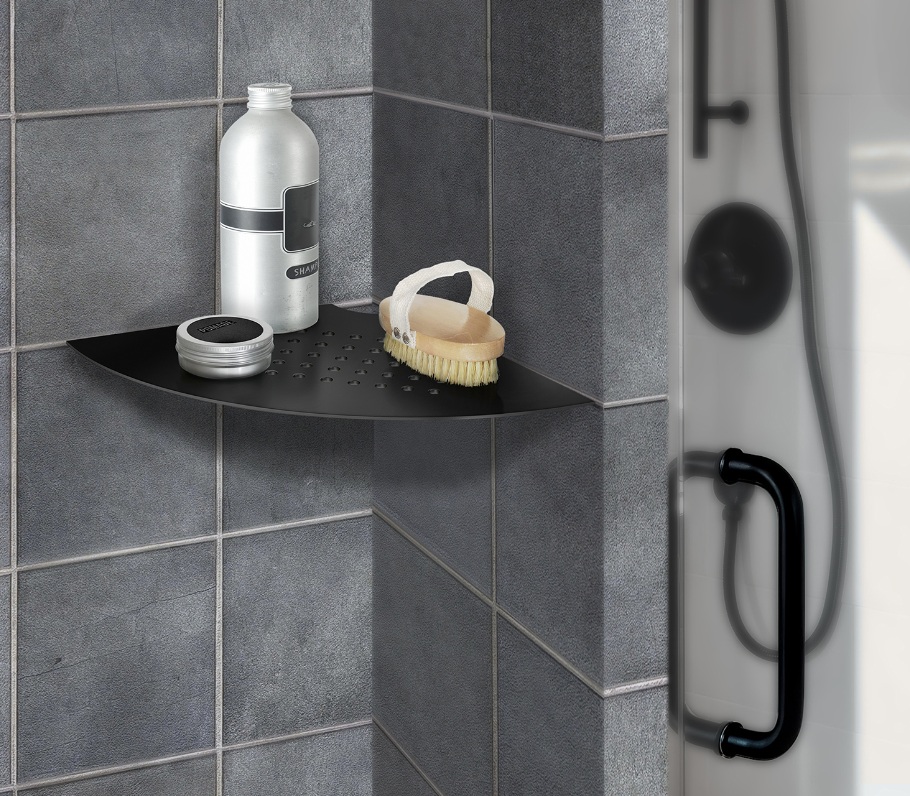 Elegant hjørnehylde fra Smedbo i mat sort. Perfekt til indmuring i brusekabinen. Mål: 200x200 mm.