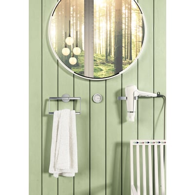 Elegant Smedbo Time klokke i poleret krom med sort urskive. Stilfuldt design til badeværelset.