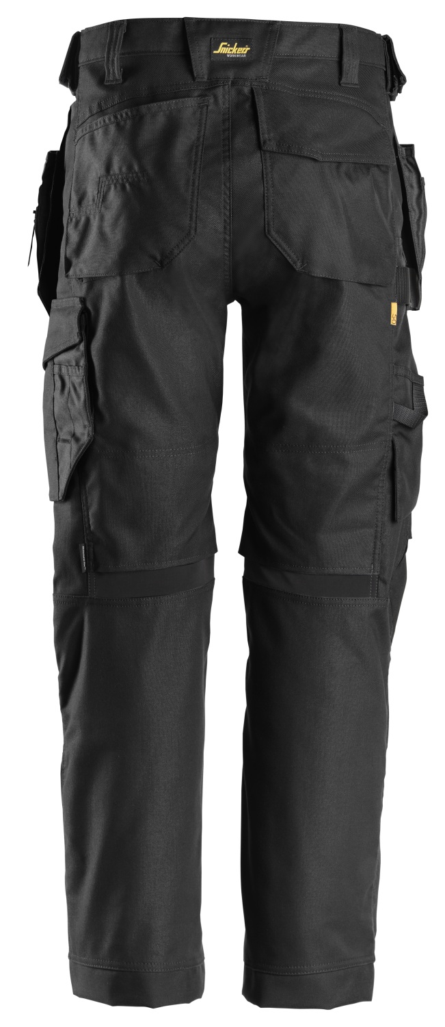 Slidstærke arbejdsbukser i Canvas+ stof med stretch og hylsterlommer. CORDURA® forstærkninger og stretchpanel ved skridtet for øget mobilitet.