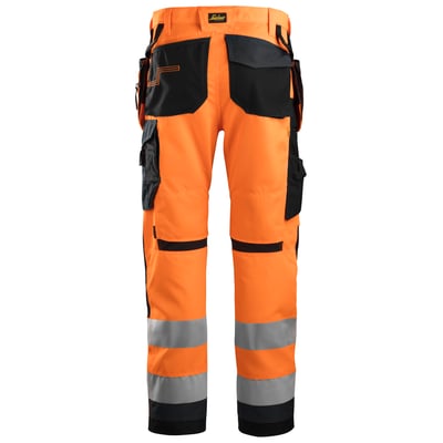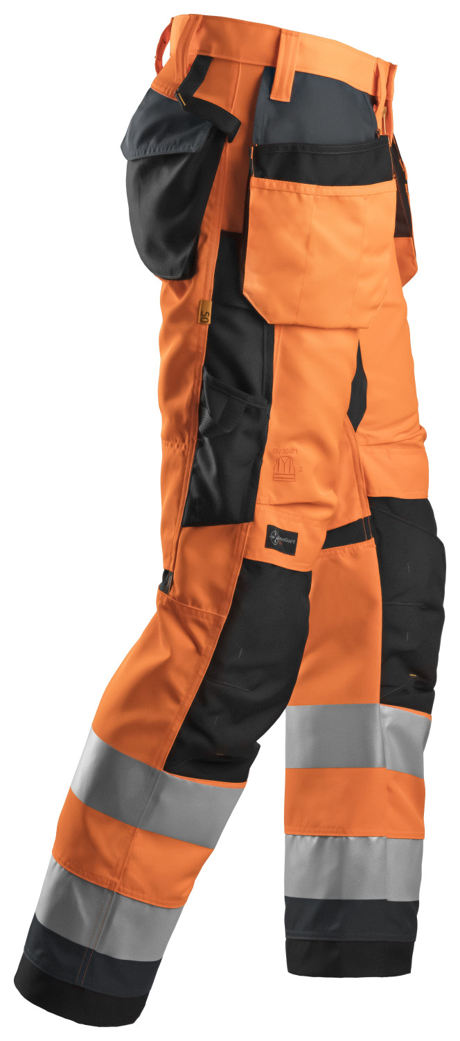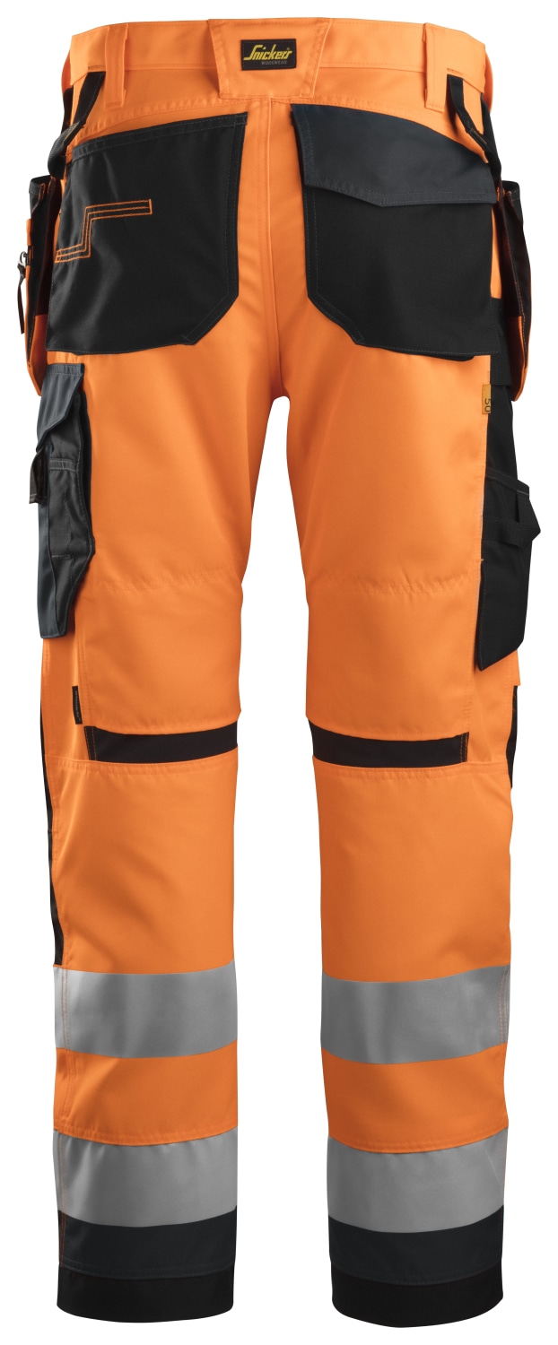 Moderne Snickers AllroundWork Hi-Vis buks med forbøjede ben, overlegen knæbeskyttelse og indbygget ventilation. Stretch Cordura® skridtkile sikrer optimal bevægelsesfrihed. Beklædningsklasse 2.