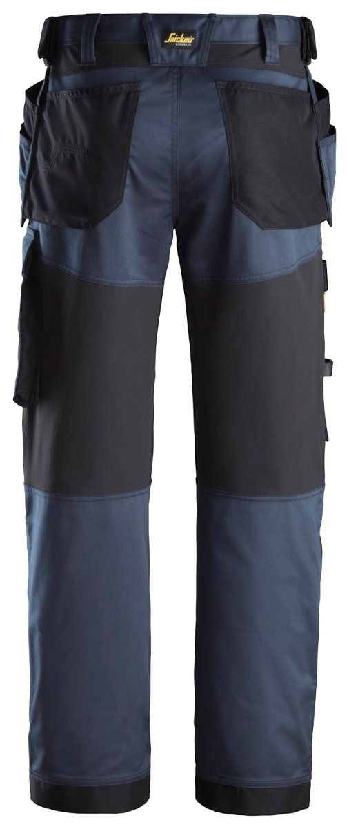 Disse AllroundWork stretch bukser er designet med et loose fit og praktiske hylsterlommer for maksimal fleksibilitet og komfort. Bukserne kombinerer 2-vejs stretch med paneler af 4-vejs stretch bagpå, hvilket sikrer uindskrænket bevægelsesfrihed under intensivt arbejde.