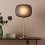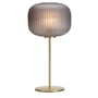 Elegant SOBER bordlampe i børstet messing og røgfarvet glas. Perfekt til indendørs brug.