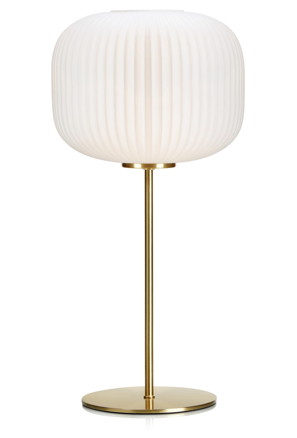 Elegant SOBER bordlampe i børstet messing og hvid. Perfekt til indendørs brug. Kræver 1 lyskilde.