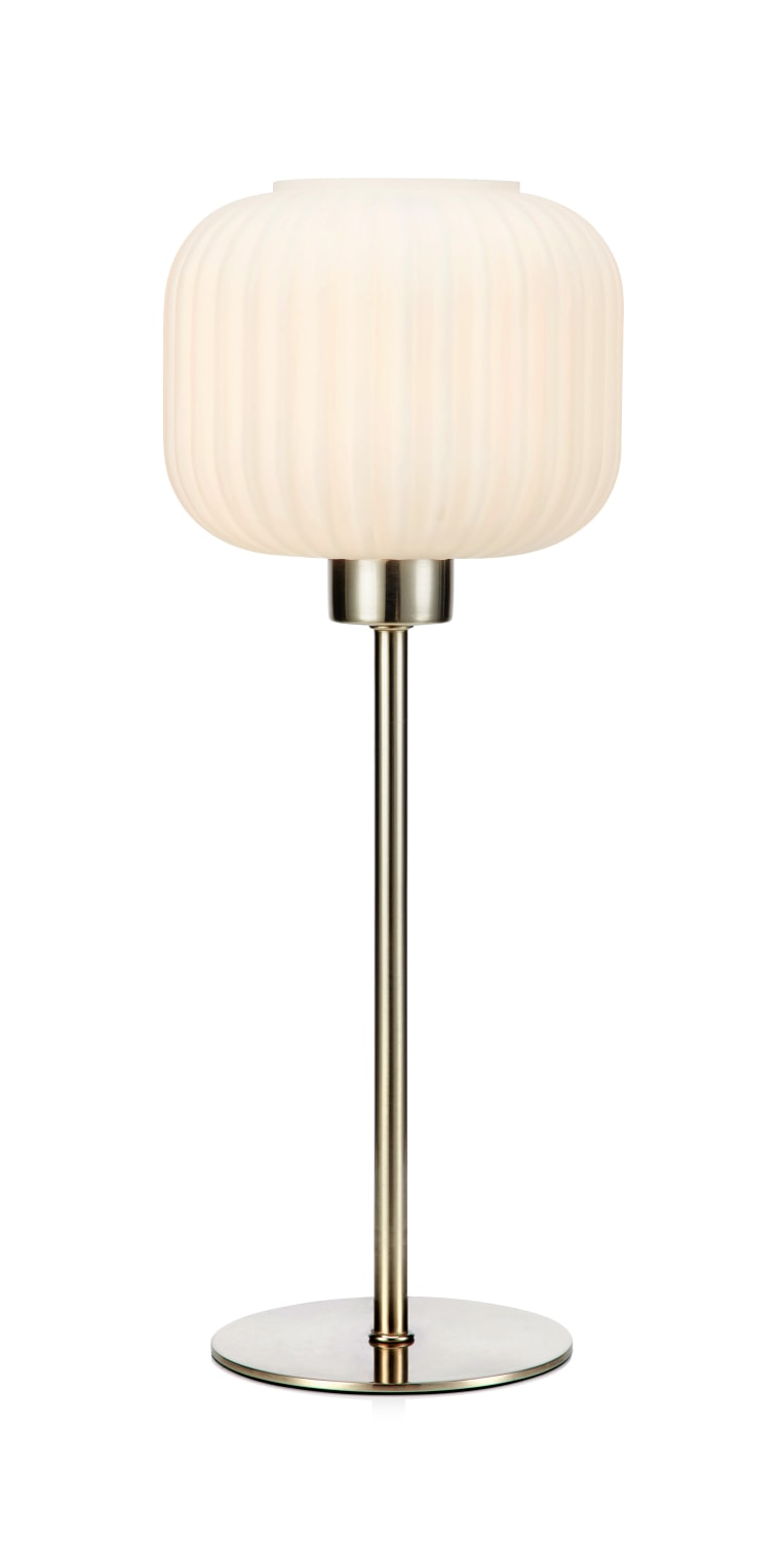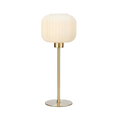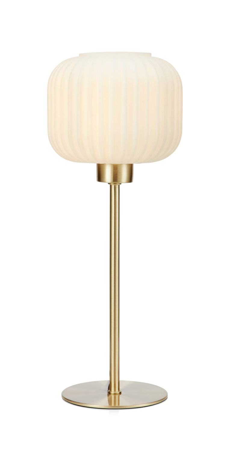 Elegant SOBER bordlampe i børstet messing og hvid. Perfekt til indendørs brug. Med afbryder på ledningen.