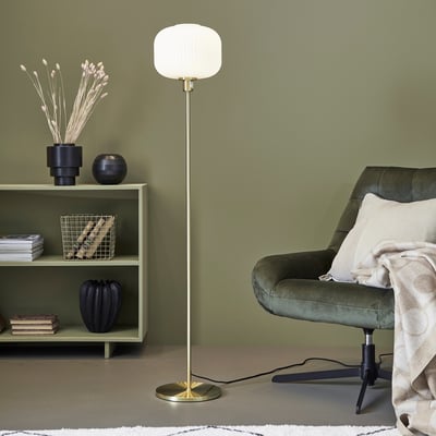 Elegant SOBER gulvlampe i børstet messing og hvidt design. Perfekt til indendørs brug med en højde på 1400 mm og klar ledning.