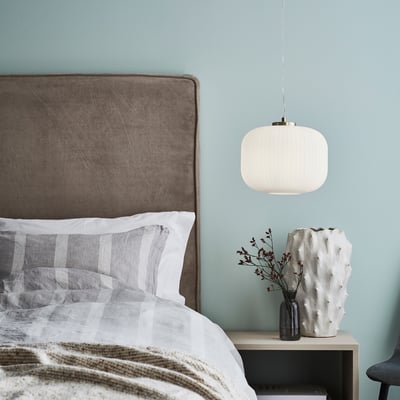 Elegant SOBER pendel i børstet messing og hvid. Perfekt til indendørs brug. Kræver 1 lyskilde (medfølger ikke).