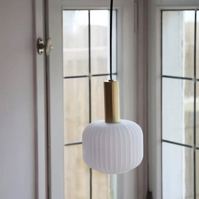 Elegant SOBER pendel i børstet messing og hvid. Perfekt til indendørs brug. Justerbar ledning på 3500 mm.