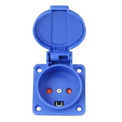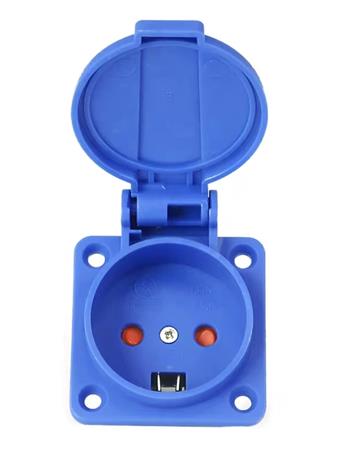 Stikdåse til indbygning med klaplåg. Dansk stikkontakt, 16A, 230V med jord og IP54-beskyttelse. Flange 50x50 mm, udført i blå polyamid.