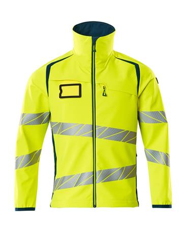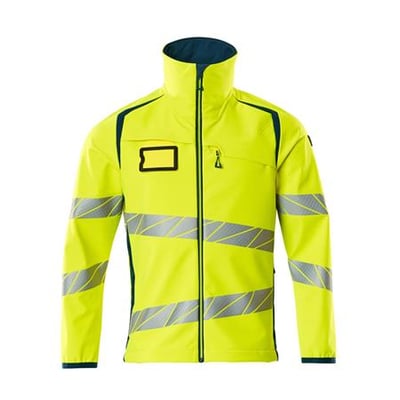 Softshelljakke model 19002-142 i hi-vis gul/mørk petroleum, størrelse 5XL. Jakken er ideel til arbejde under dårlige lysforhold.
